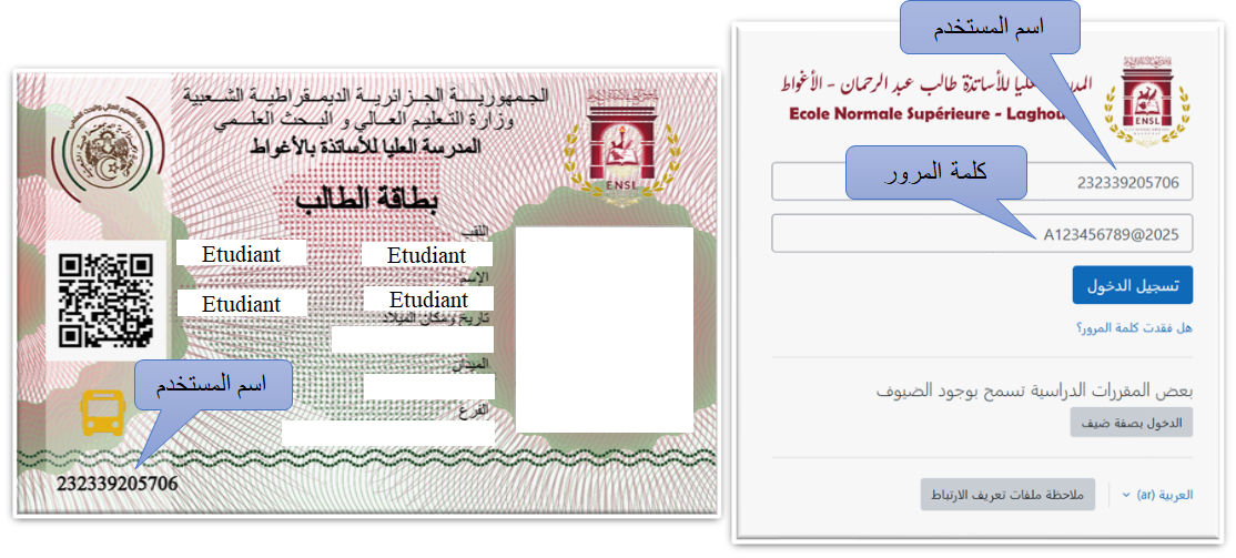 إسم المستخدم هو رقم تسجيل البكالوريا المكون من 12 ارقام الموجود في بطاقة الطالب وكلمة السر موحدة لجميع طلبة السنوات الاولى وهي (A123456789@2025)  .